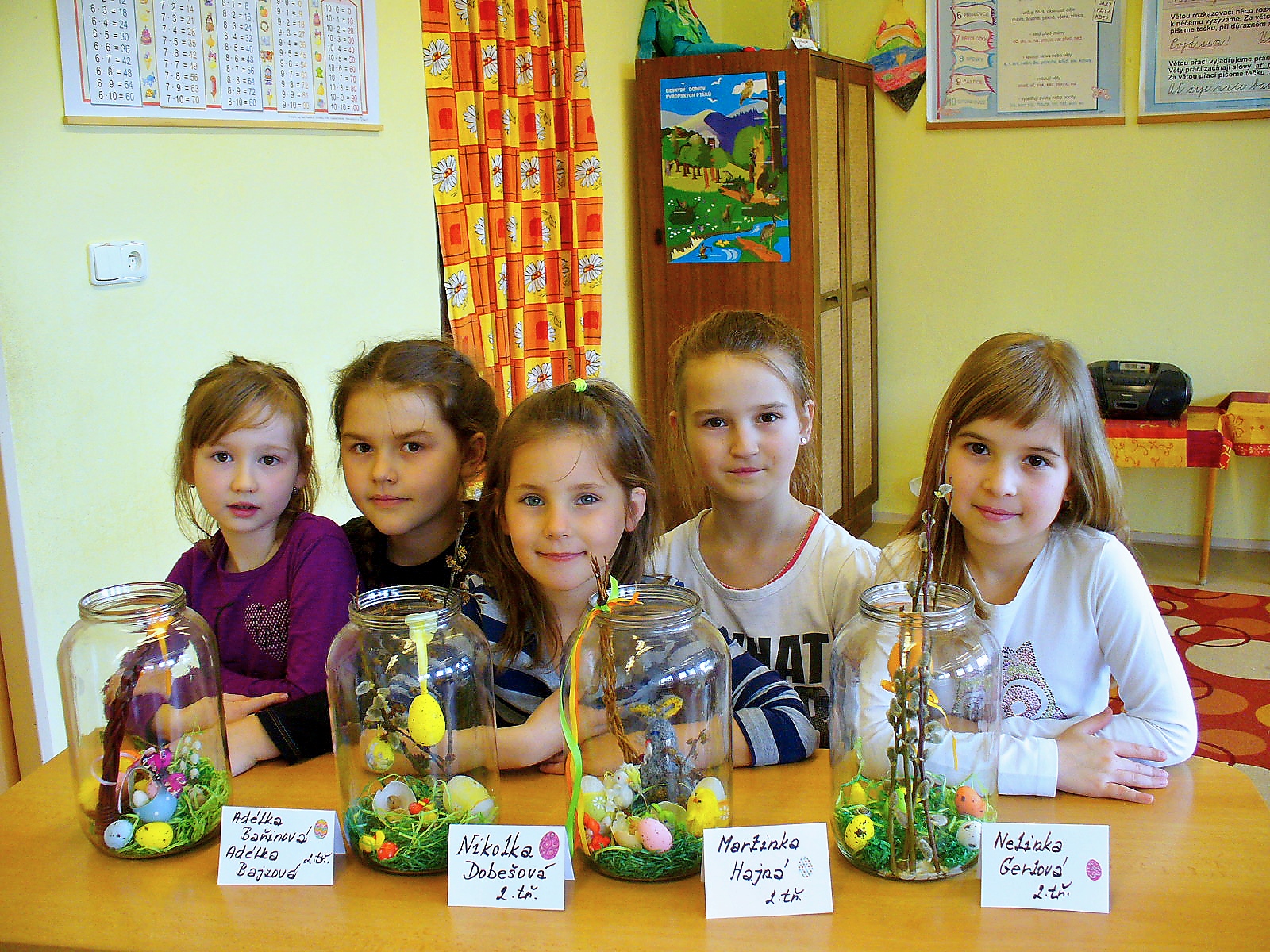 A už je to opět tady! Děti ze 2. třídy se už na jaro velmi těšily a tak pokračovaly pilně v práci na svém celoročním projektu a obsah svých zimních sklenic vyměnily v pondělí 24. března za jarní. Sněhuláci tedy byli nahrazeni kraslicemi, kuřátky, zajíčky, ovečkami, přiletěli i motýlci, kteří mimochodem vypadají jako živí, a místo jehličnatých větviček děti přinesly proutky kočiček, jehnědů a břízy.