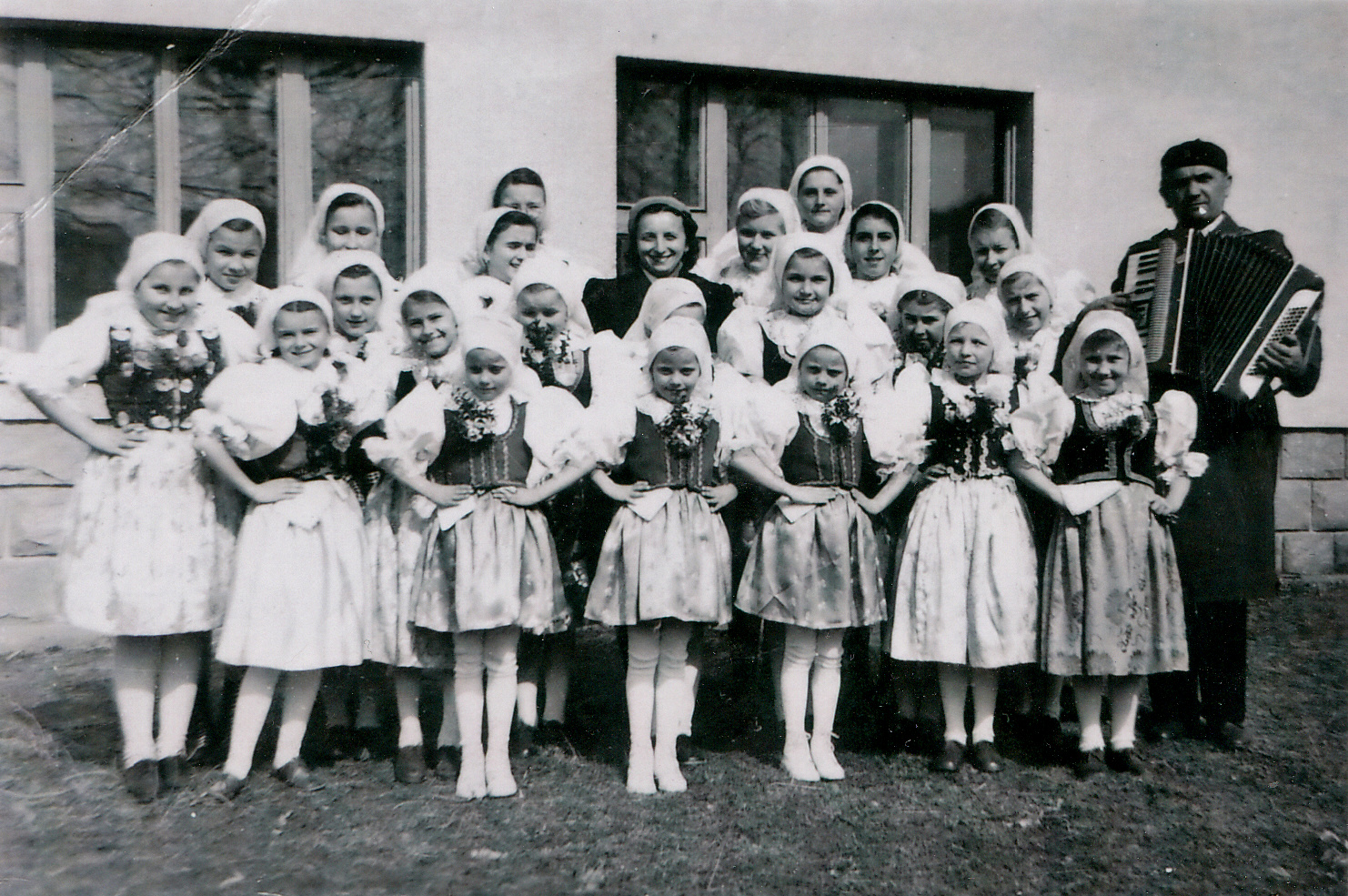 Na archivním snímku z roku 1954 tehdejší členky Valašenky s učiteli Barborou Kantorkovou a Štěpánem Tvarůžkem, který soubor v začátcích doprovázel na harmoniku. V té době byl valašský kroužek ryze dívčí, navštěvovala ho i trojčata Dolanská – Vlasta, Karla a Jarka. Chlapci se přidali až později.
