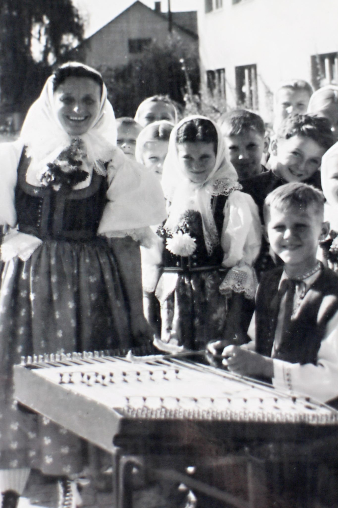 Barbora Kantorková se svými svěřenci. Na cimbál hrál osmiletý Josef Cáb, v té době nejmladší cimbalista v České republice.
