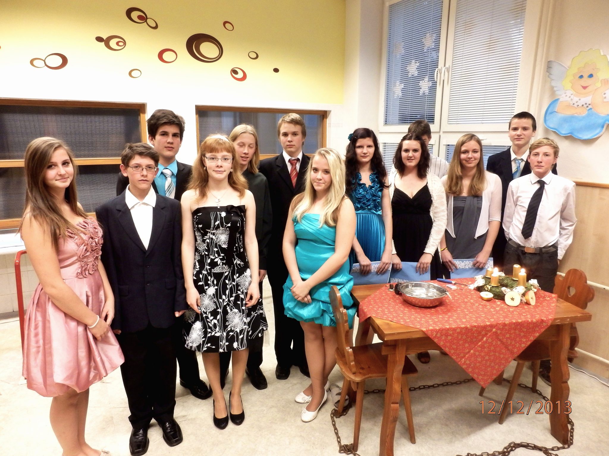 Ve čtvrtek 12. prosince, jsme se slavnostně sešli v jídelně naší školy, abychom společně přivítali dobu Vánoc. Dopoledne jsme předvedli, my jako deváťáci, náš program našim spolužákům, učitelům, paní starostce a panu řediteli. Připomněli jsme si tehdejší zvyky a tradice. Například krájení jablíčka, lití olova, házení papučí nebo svazování štědrovečerního stolu Hlavní myšlenkou tohoto programu bylo, si připomenout všechny svátky, jež se v prosinci slaví a za jakým účelem. Samozřejmě, že nechyběly ani vánoční koledy. Jak české, tak anglické. Odpoledne jsme tentýž program zopakovali, akorát menší změna pro nás byla v tom, že jsme se nepředváděli našim spolužákům, ale našim příbuzným. Myslíme, že se nám toto zpříjemnění vánočního času podařilo navodit. Rozloučili jsme se písní Let it snow a všechny diváky jsme krásně zasněžili. Nakonec jsme všem popřáli krásné Vánoce a klidný vstup do Nového roku.