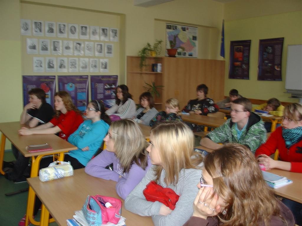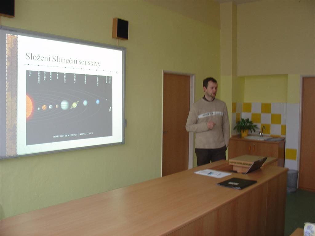 Ve čtvrtek 15. dubna 2010 se deváťáci naší školy začali potýkat s nejkrásnější oblastí fyziky – astronomií. Začali jsme malým drobkem vesmíru – naší sluneční soustavou. Pro úvodní prezentaci jsme si pozvali pracovníka Hvězdármy ve Valašském Meziříčí pana Tomáše Pečivu, který nás během dvou hodin velmi poutavě „provedl“ naší sluneční soustavou. Velkou výhodou při prezentaci byla nová učebna přírodovědných předmětů vybavená interaktivní tabulí a dataprojektorem, kterou jsme vybudovali díky realizaci projektu „Zavádění nových vyučovacích metod a využití ICT“ (CZ.1.07/1.1.08/01.0026). V rámci výuky fyziky v 9. ročníku je v naší škole v současné době výstava „Člověk na Měsíci“, kterou rovněž připravili pracovníci Hvězdárny ve Valašském Meziříčí.