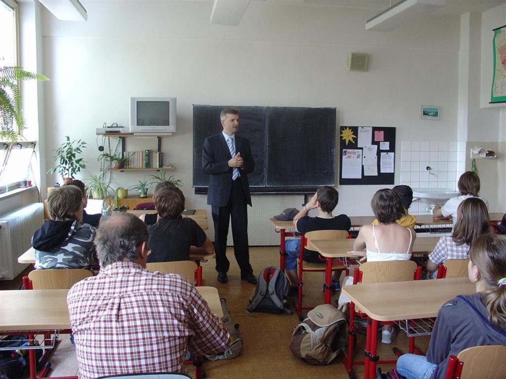 Žáci 8. a 9. třídy naší školy měli možnost setkat se s poslancem Evropského parlamentu panem Tomášem Zatloukalem, který kandidoval za Zlínský kraj. Pod vedením učitele občanské výchovy pana L. Ludvigha mu žáci 9. třídy adresovali pozvání k besedě na naší škole. V pondělí 28. května tak měli možnost sekat s ním a s jeho asistentkou. Po úvodním seznámení s fungováním evropských institucí následovaly dotazy žáků. Na závěr obdržely děti informační materiály o EP.